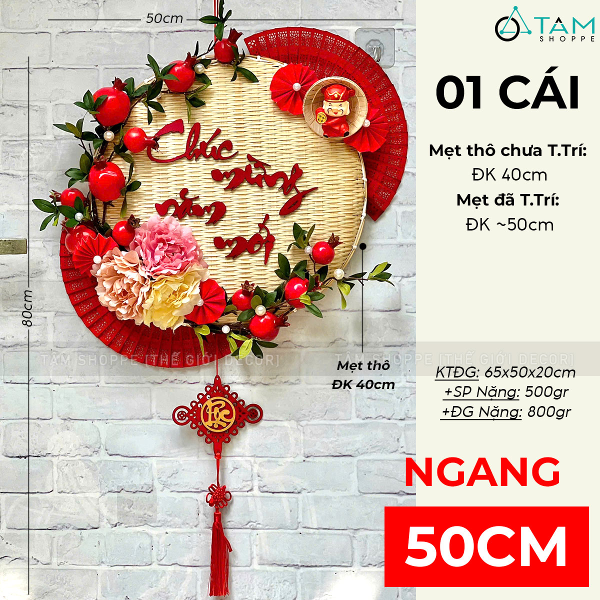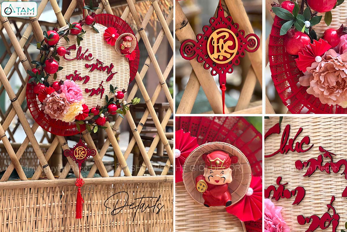 SP được làm từ mẹt tre nhẹ, được trang trí với các phụ kiện Handmade như chữ gỗ CMNM, cành lựu, quạt gỗ...thành phẩm có chiều ngang 50cm, tổng chiều dài tính luôn dây tua rua là 80cm