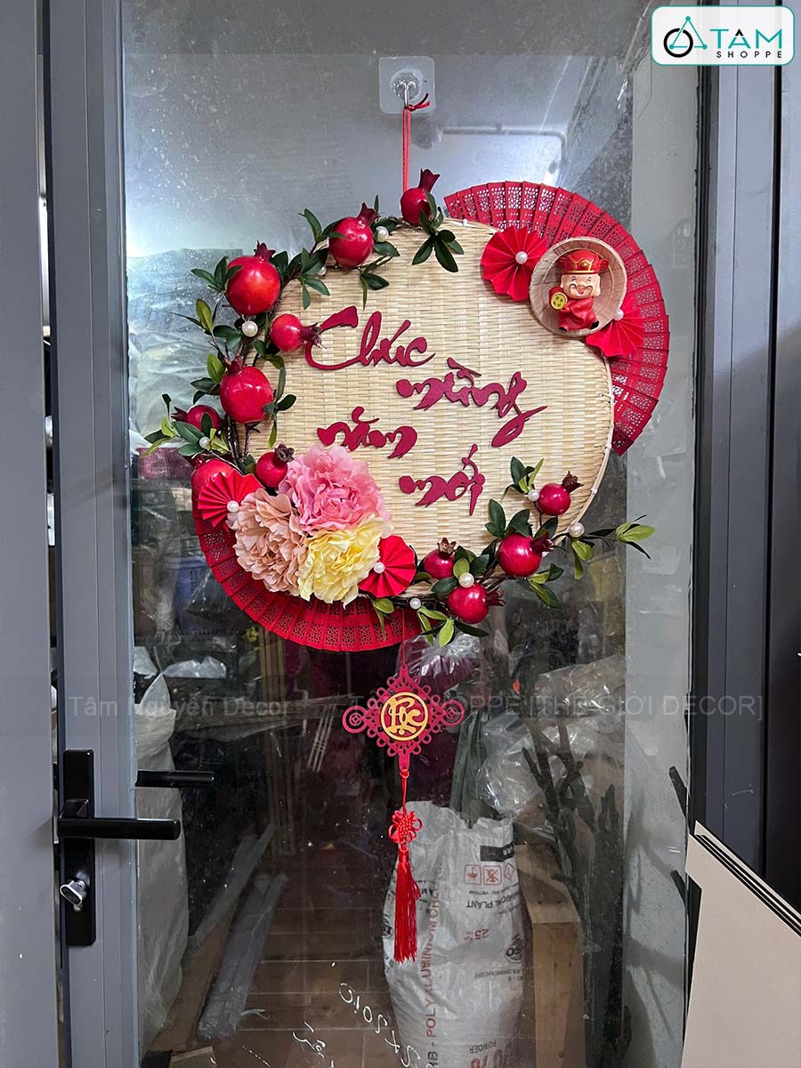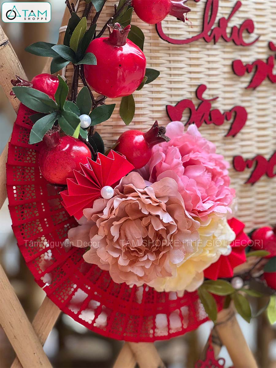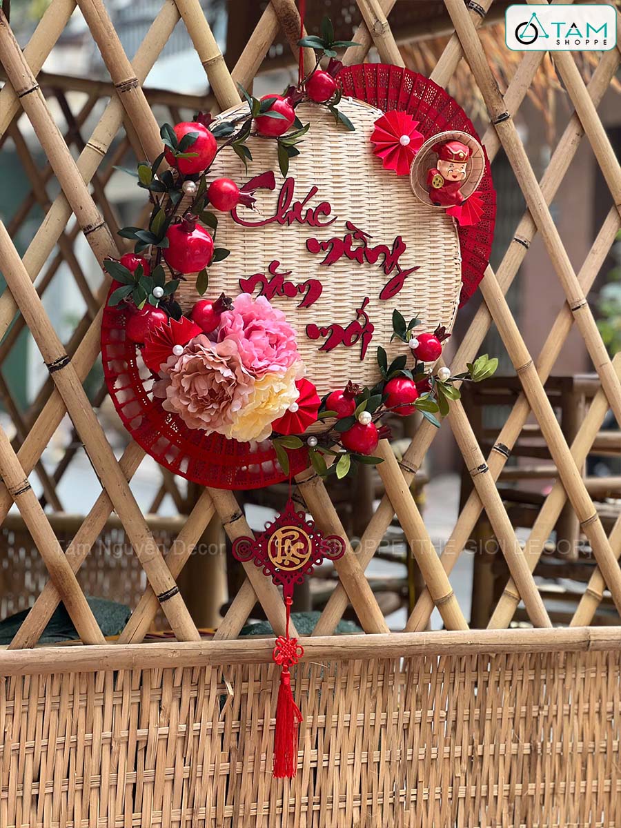 Vòng treo cửa mẹt tre Chúc Mừng Năm Mới cành lựu quạt Đỏ [Vòng nhẹ] N50cm trang trí đẹp mắt.
