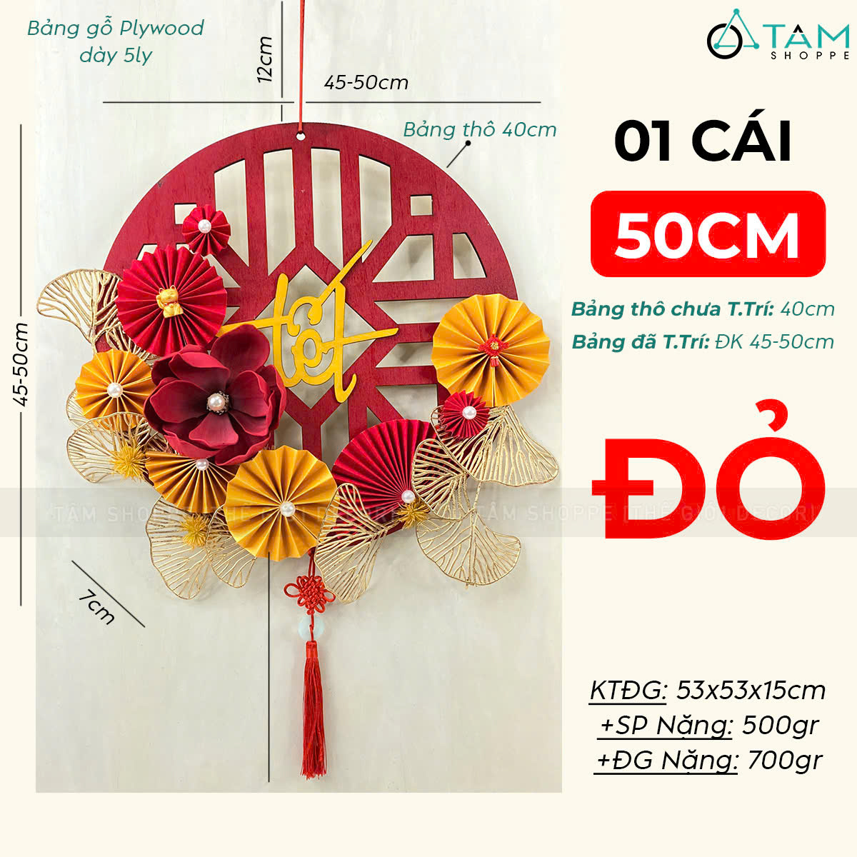 SP được làm từ Bảng gỗ Plywood dày 5ly, được trang trí với quạt giấy xếp, bên trên là đồ trang trí Handmade như cành rẻ quạt, đào đông...