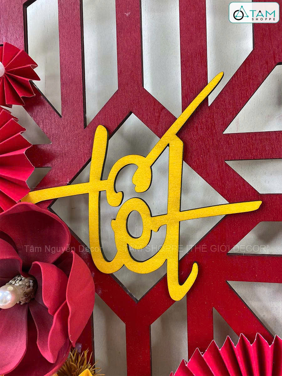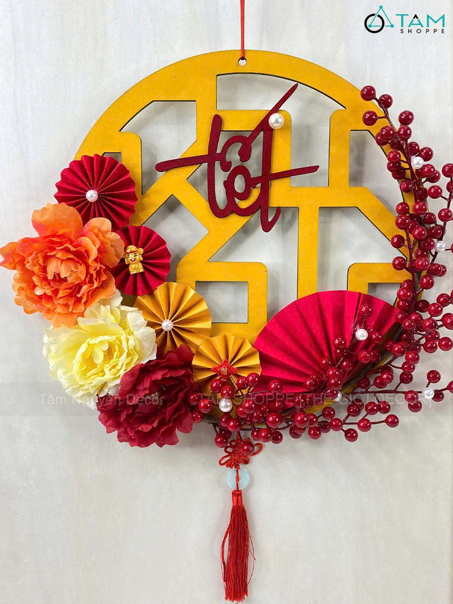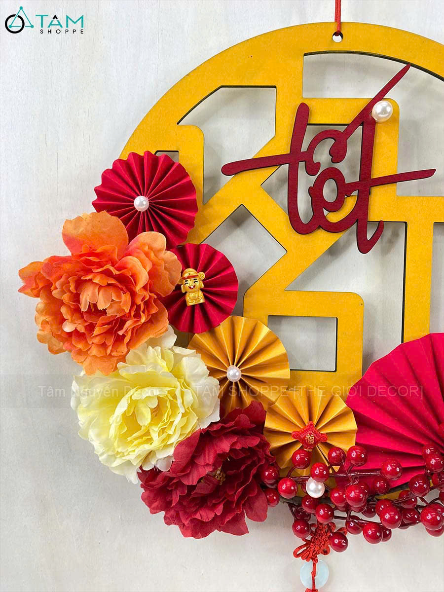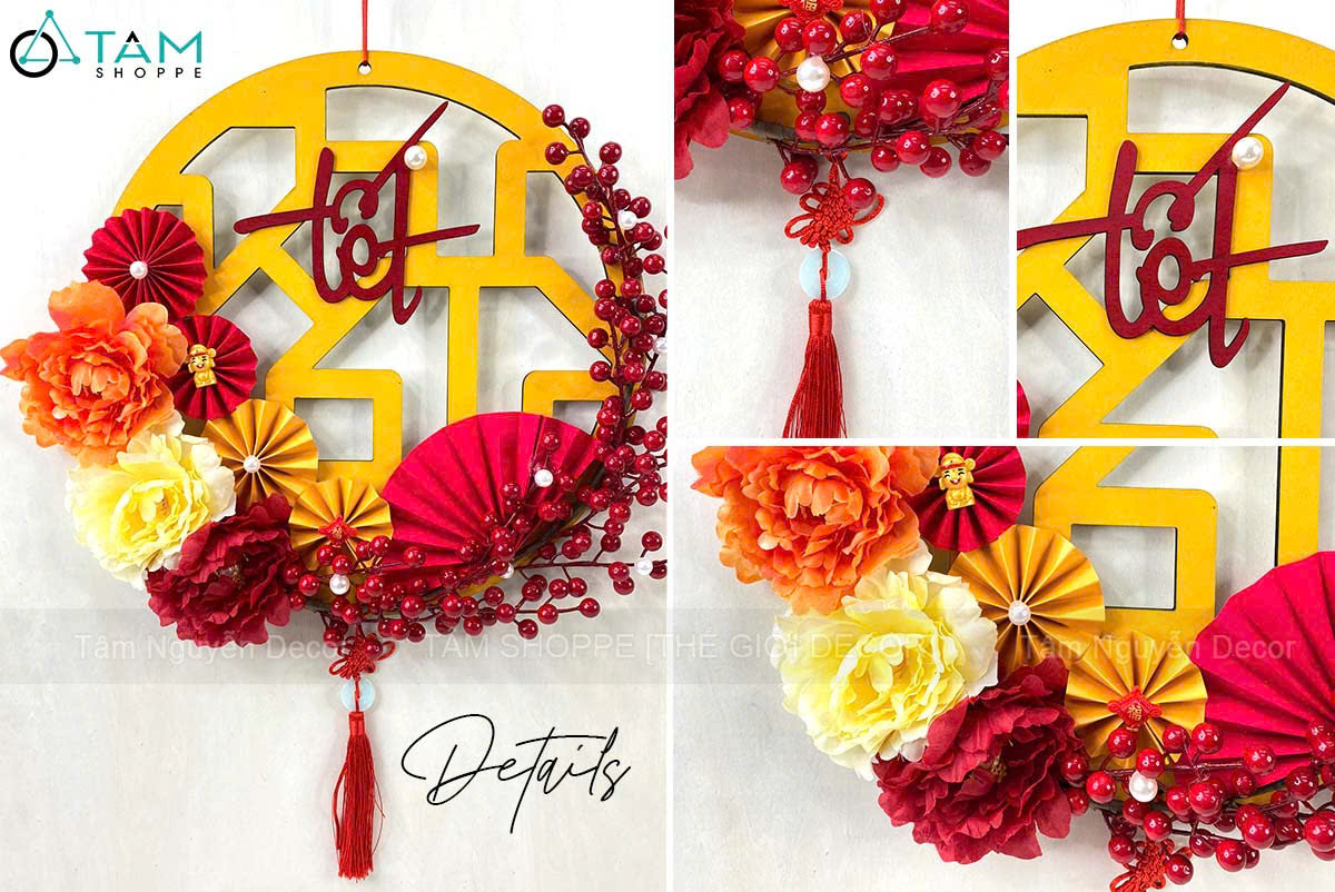 Vòng treo cửa Tết họa tiết khung cửa chữ Tết [Bằng gỗ] ĐK 50cm trang trí đẹp mắt. Đồ trang trí Tết là các vật dụng, phụ kiện, hoặc mô hình được dùng để trang hoàng không gian trong dịp lễ, nhằm tạo nên không khí ấm áp, vui tươi và mang đậm sắc màu lễ hội.