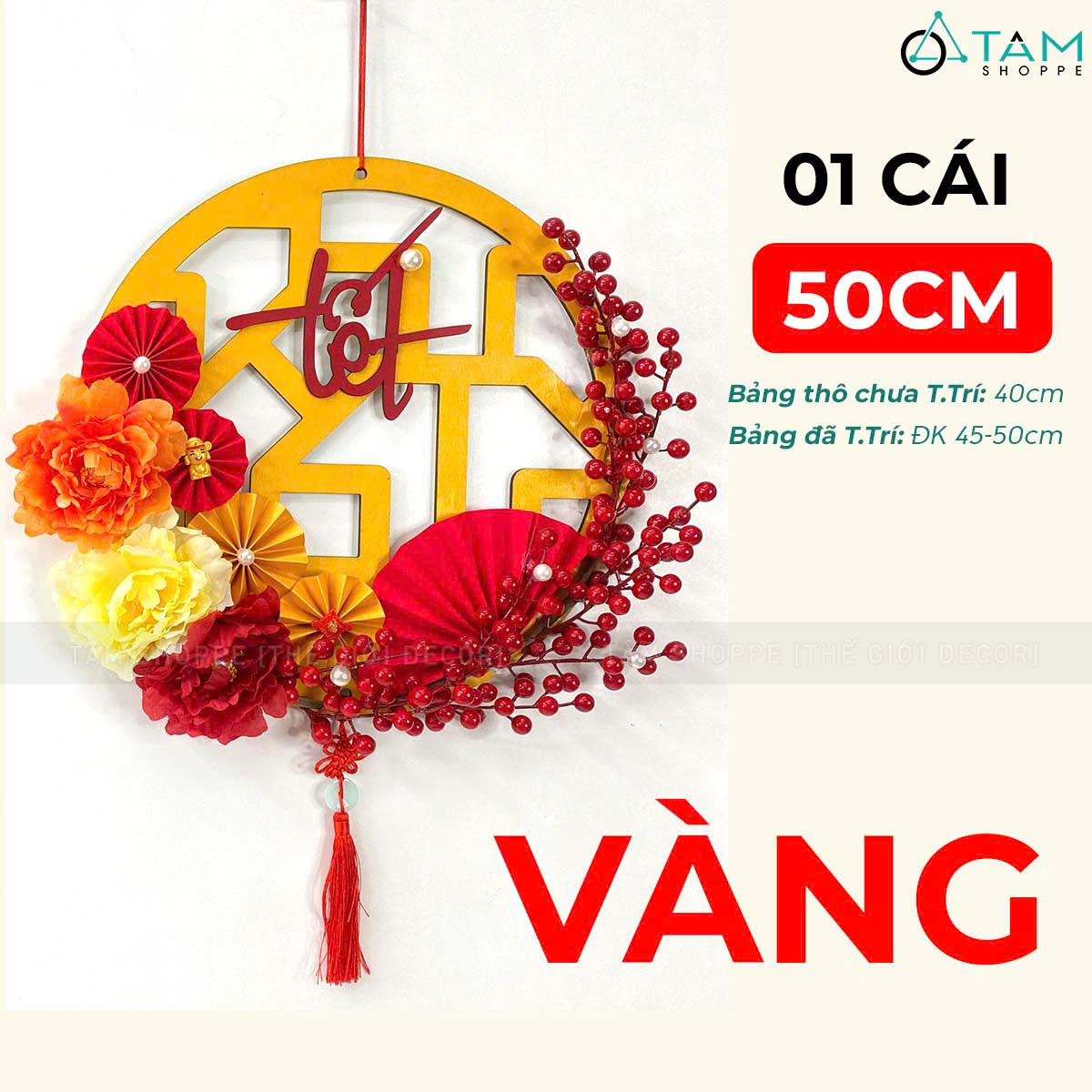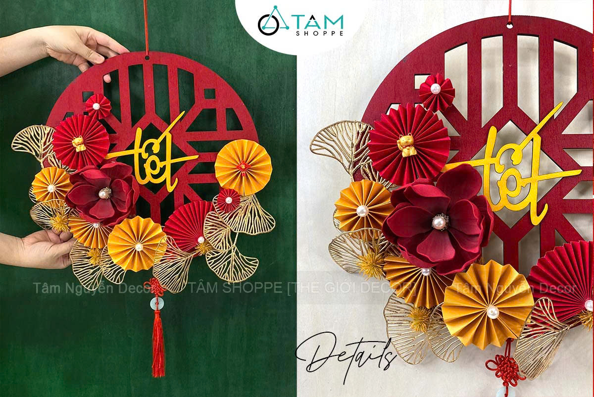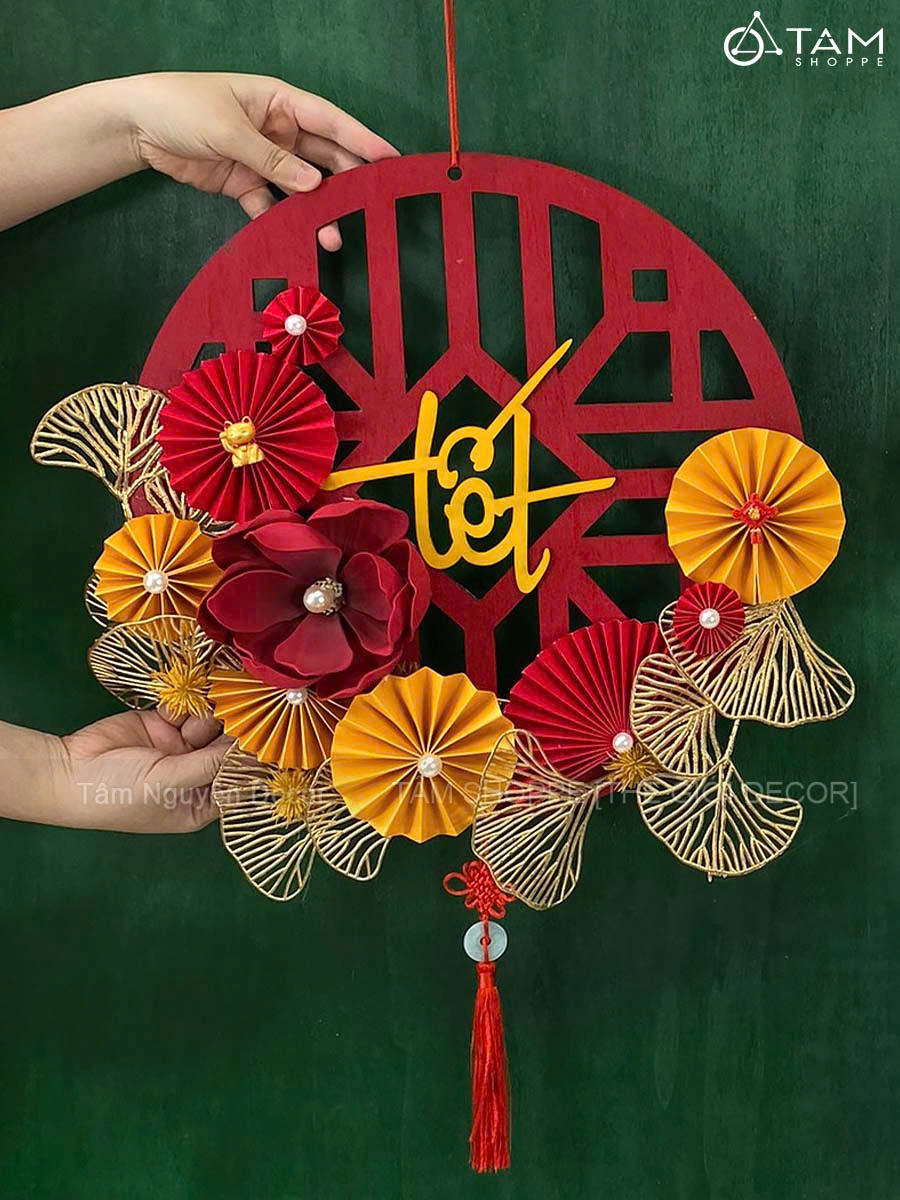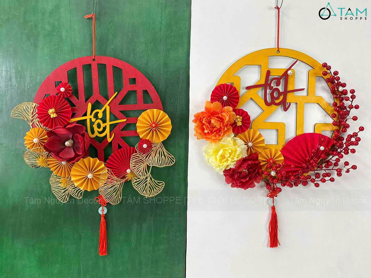 Vòng treo cửa Tết họa tiết khung cửa chữ Tết [Bằng gỗ] ĐK 50cm trang trí đẹp mắt. Đồ trang trí Tết là các vật dụng, phụ kiện, hoặc mô hình được dùng để trang hoàng không gian trong dịp lễ, nhằm tạo nên không khí ấm áp, vui tươi và mang đậm sắc màu lễ hội.