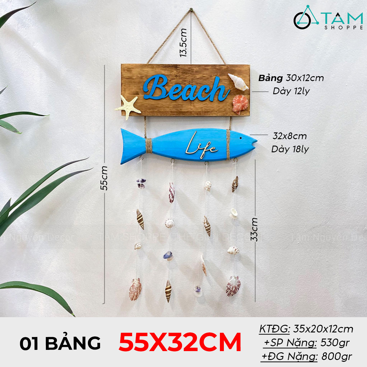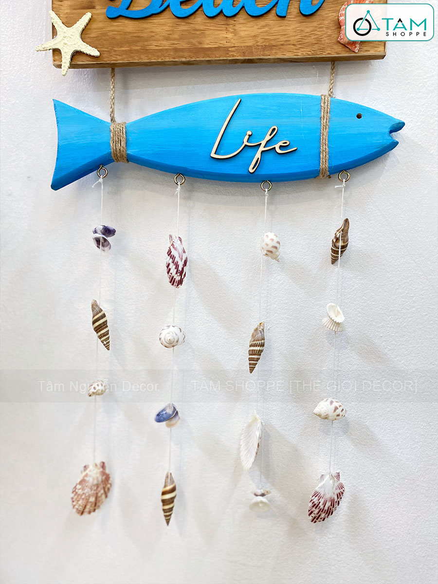 Bảng treo chủ đề biển Beach Life Cá Xanh treo ốc [dây thừng - vỏ ốc thật] KT55x32cm trang trí đẹp mắt.
