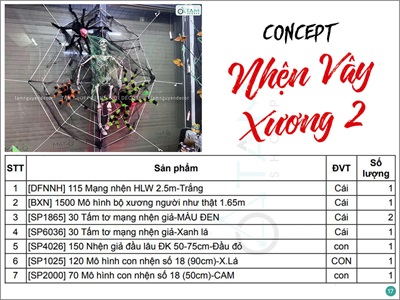 Tiểu cảnh này đơn giản và khá dễ thực hiện, thích hợp giăng các khung cửa sổ, cửa kính trước Shop. Có thể linh động dùng mạng nhện đen hoặc trắng, tơ nhện phối màu ngược lại với mạng nhện. Thêm tơ màu xanh lá để tạo hiệu ứng phản quang bắt sáng khi có ánh đèn chiếu vào. Dùng các con nhện đủ màu và kiểu để tạo sự thu hút cho tiểu cảnh. Nếu được, set-up một chiếc đèn pha Led RGB đổi màu rọi vào bộ xương người để thêm hiệu ứng ma mị.