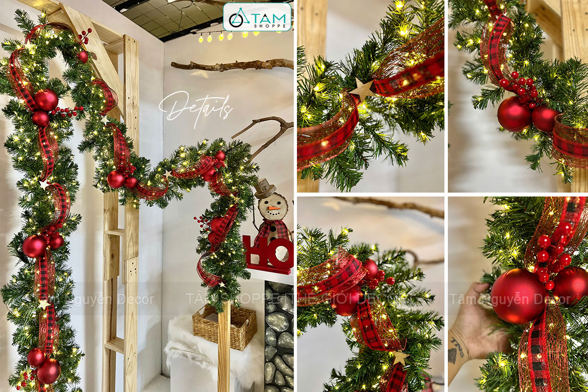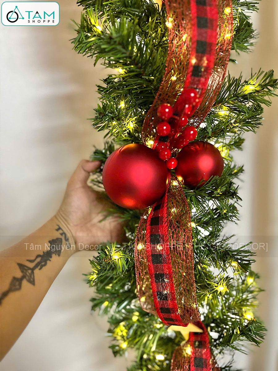Dây lá thông Noel châu mờ ruy băng đỏ dài 3M [Bản lớn - Nhiều lá - Đèn đom đóm] trang trí đẹp mắt