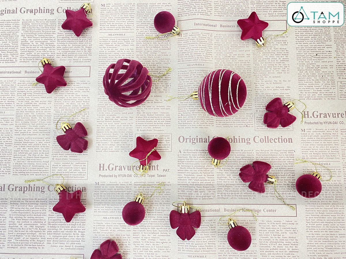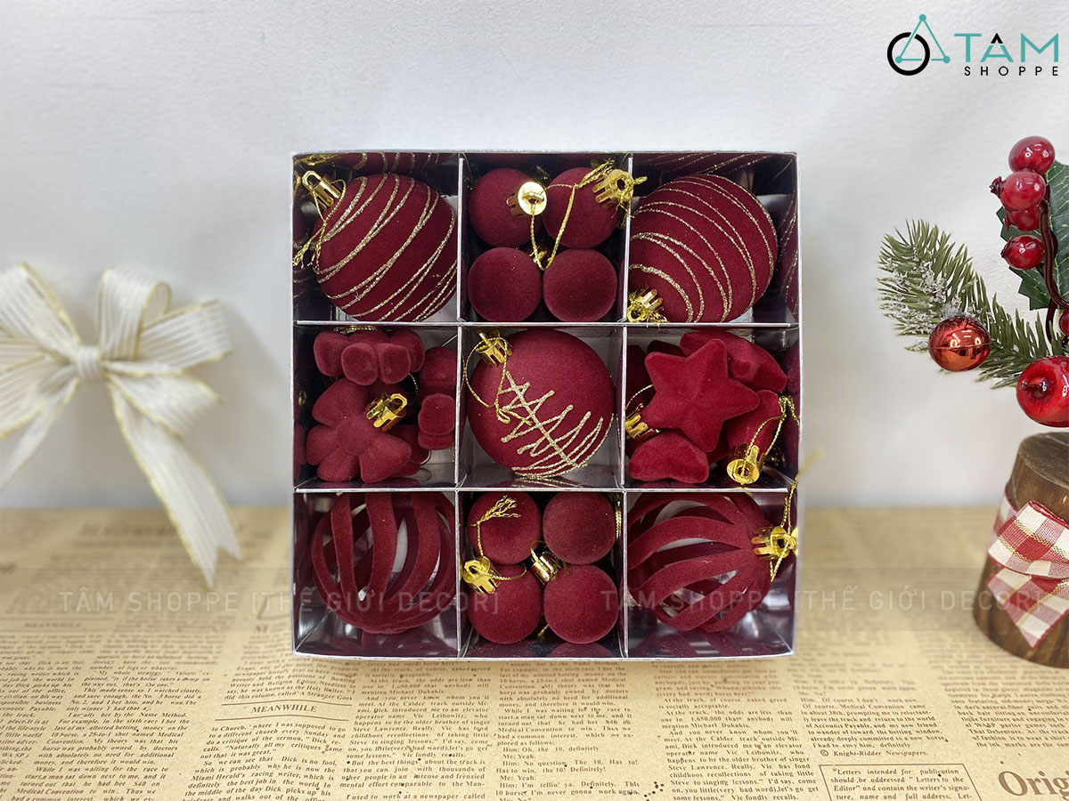 Hộp 35 phụ kiện châu nhung Đỏ phun kim tuyến Vàng [Nhiều kiểu - ĐK 3-6cm] trang trí đẹp mắt. Đồ trang trí Noel là các vật dụng, phụ kiện, hoặc mô hình được dùng để trang hoàng không gian trong dịp Giáng Sinh (Noel), nhằm tạo nên không khí ấm áp, vui tươi và mang đậm sắc màu lễ hội.