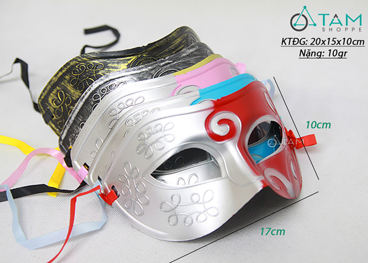 Mặt nạ bằng nhựa và phụ liệu handmade, thiết kế che nửa mặt trên. Có dây đeo và vừa vặn với người lớn.