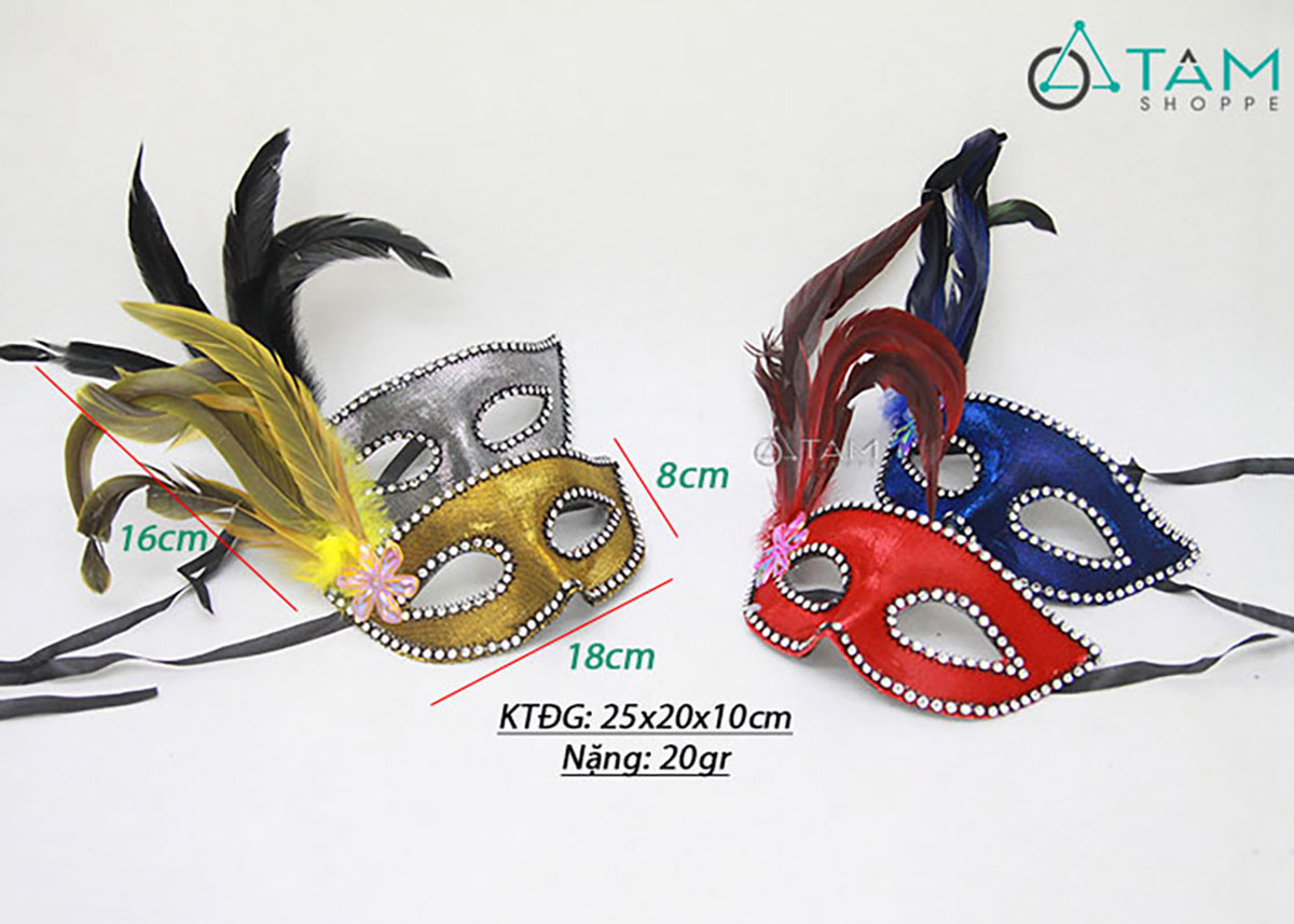 Mặt nạ bằng nhựa và phụ liệu handmade, thiết kế che nửa mặt trên. Có dây đeo và vừa vặn với người lớn.