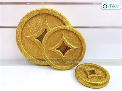 - Đồng tiền hình tròn có bế lỗ ở giữa, làm bằng chất liệu mút xốp phủ kim tuyến vàng đều đẹp mắt. Tùy loại được phủ một hoặc hai mặt.